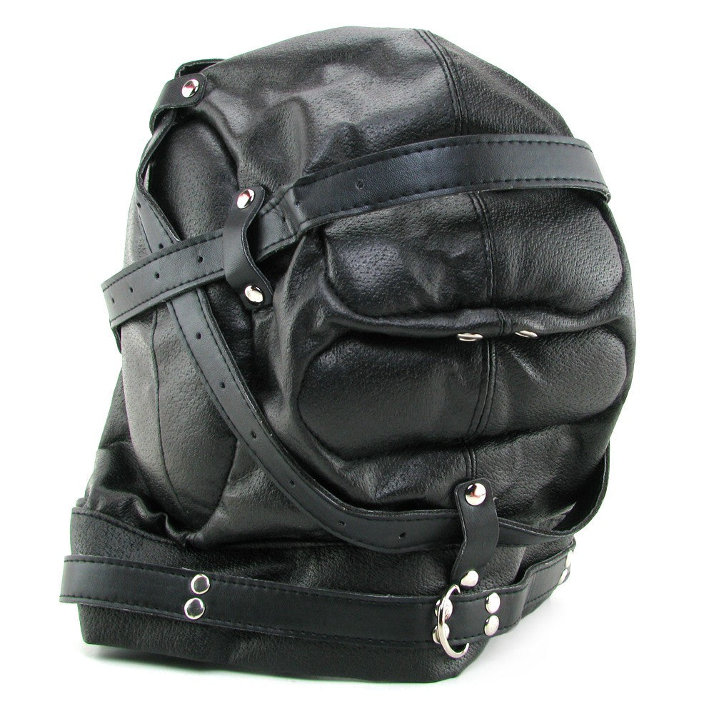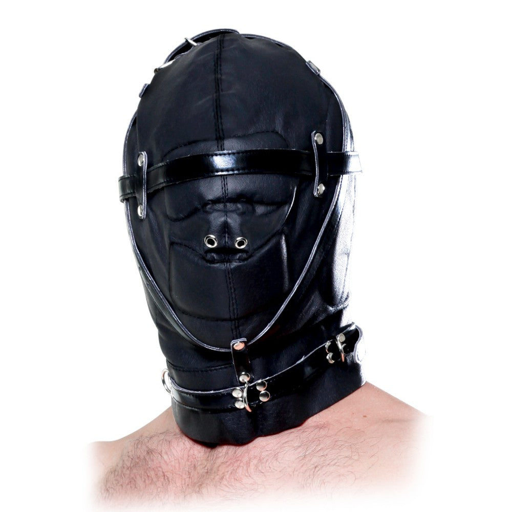 Catering to the more serious bondage and fetish players, this sensory deprivation hood is a high quality faux leather piece that efficiently blocks sight, sound, taste and smell while cushioning the head against more rough and tough scenarios. Completely adjustable for the perfect fit, the hood buckles around back in two places, and ties closed with corset-style laces reinforced with metal rivets. Three strategically placed O rings at the collar can be attached to any number of leashes and restraints. Metal edged holes at nose level keep your submissive breathing comfortably.