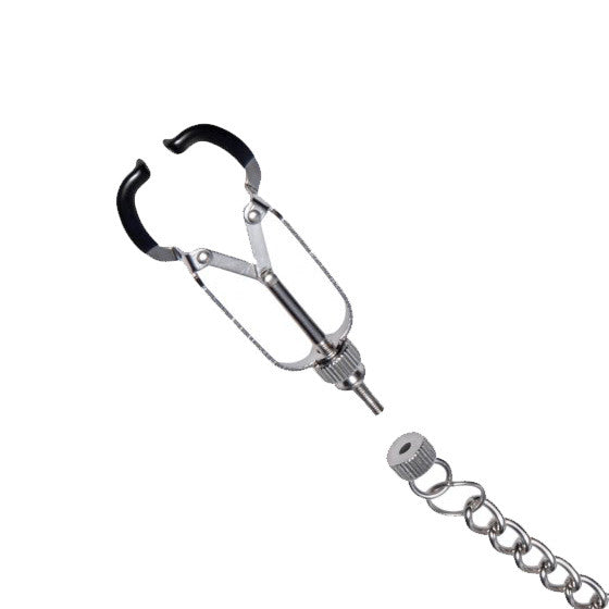 Designed for precision and strength, the Bauhaus Nipple Vice comes to you with two clamps that can be adjusted to your desired level of tightness with the adjusting screws located at the base. The tips are covered in soft TPR with the addition of a delicate curve at the very end that assists in gripping the skin of your subject. Ending this commanding piece is the addition of a 12 inch connecting chain that looks oh so enticing as it hangs from the captive nipples of your plaything.