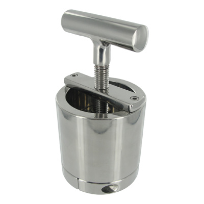 Make your sub beg with the heavy steel Ball Press Chamber. Secure the removable ring around their scrotum, then place their balls into the hollow chamber. Use the included hex key to lock the ring onto the end of the chamber and their boys are now enclosed in a cool steel cylinder. Now you are in control! As you slowly turn the T-handle, a steel disc inside the Press Chamber descends on their balls, gradually reducing the amount of space inside the cylinder. Warn them with a bit of gentle pressure, then maybe tighten things down some more for some more serious discipline. Get instant compliance to your slightest demand, every time, with the steel Ball Press Chamber!