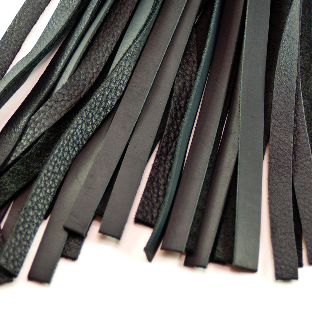 This flogger is a beautiful beast—literally a wolf lurking in sheep’s clothing. Take your heaviest belt leather, cut it into strips, finesse the edges and anchor it firmly as the central core. Next wrap the brutality of those falls in the beautiful texture of soft elk hide; the core gives you weight and increased swing speed (not to mention the potential for lovely lash marks if wielded by the right hands) while the elk lends a kiss of warmth and sensuality.